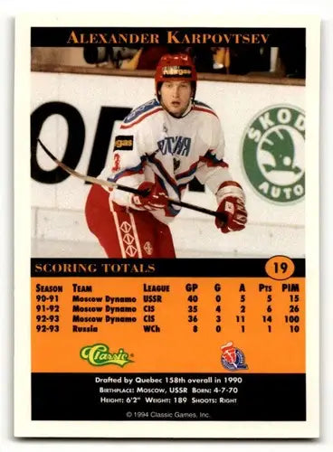 1994 Classic Pro Prospects #19 Alexander Karpovtsev Russia Hockey Ca ID:55496