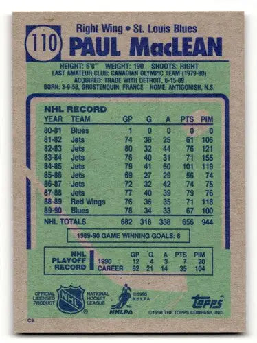 1990 Topps #110 Paul MacLean St. Louis Blues Hockey Cards NM Near Mi ID:55531