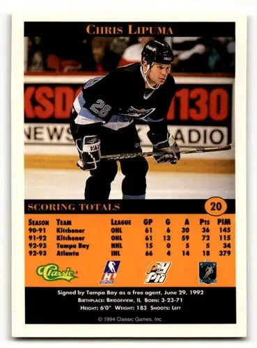 1994 Classic Pro Prospects #20 Chris Lipuma Atlanta Knights Hockey C ID:55495