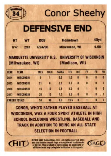 2018 SAGE Hit Premier Draft #34 Conor Sheehy NM-MT ID:44414