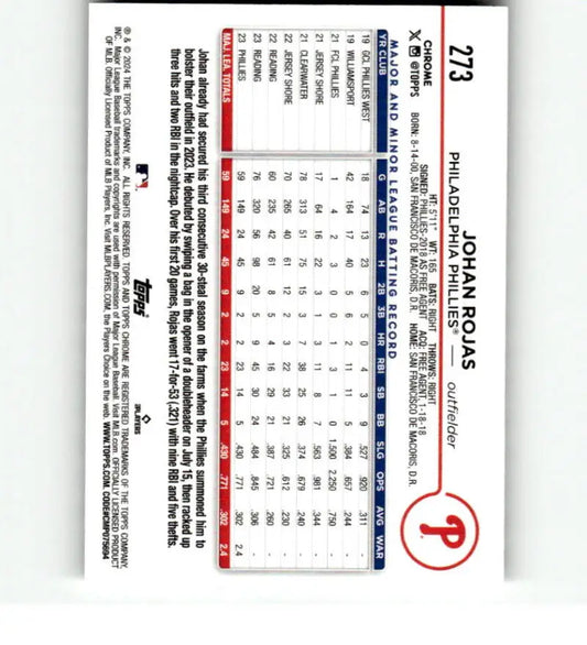 2024 Topps Chrome X-Fractor #273 Johan Rojas NM-MT RC Rookie Philadelphia Phillies Baseball Card