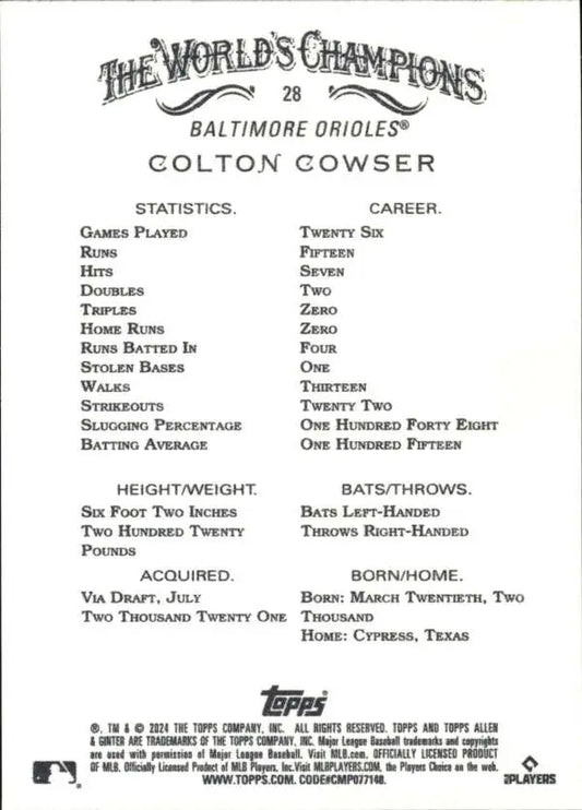 2024 Allen & Ginter #28 Colton Cowser NM-MT RC Rookie Baltimore Orioles Baseball Card