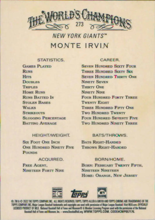 2022 Topps Allen and Ginter Chrome #273 Monte Irvin NM-MT New York Giants Baseball Card