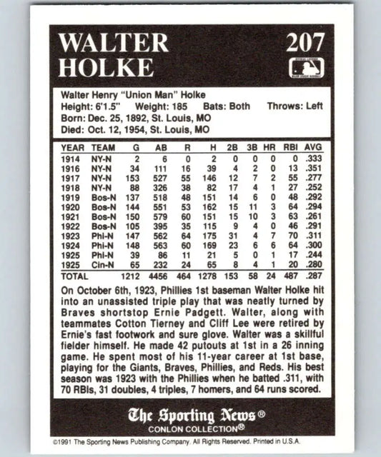 1991 Conlon Collection #207 Walter Holke EX Excellent Philadelphia Phillies Baseball Card