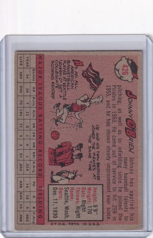 1958 Topps Baseball #426 Johnny O'Brien - Pittsburgh Pirates