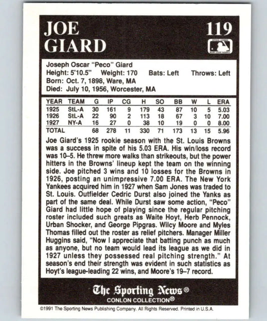 1991 Conlon Collection #119 Joe Giard EX Excellent New York Yankees Baseball Card