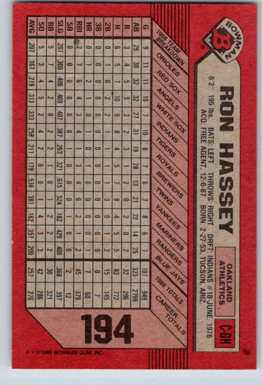 1989 Bowman #194 Ron Hassey NM-MT Oakland Athletics Baseball Card