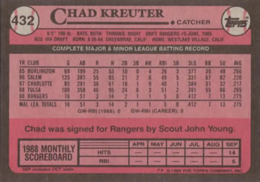 1989 Topps #432 Chad Kreuter NM-MT RC Rookie Texas Rangers Baseball Card