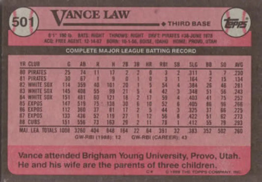 1989 Topps #501 Vance Law NM-MT Chicago Cubs Baseball Card