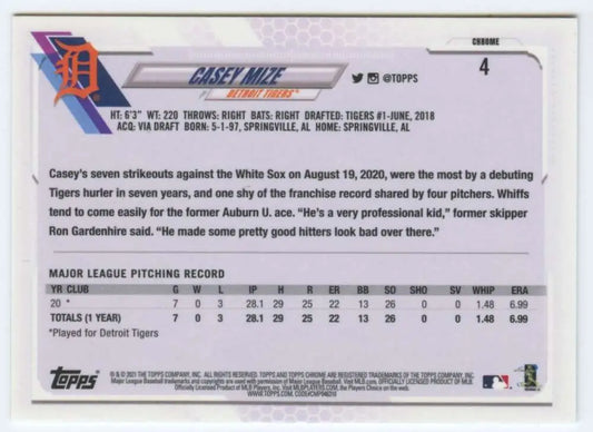 2021 Topps Chrome #4 Casey Mize NM-MT RC Rookie Detroit Tigers Baseball Card