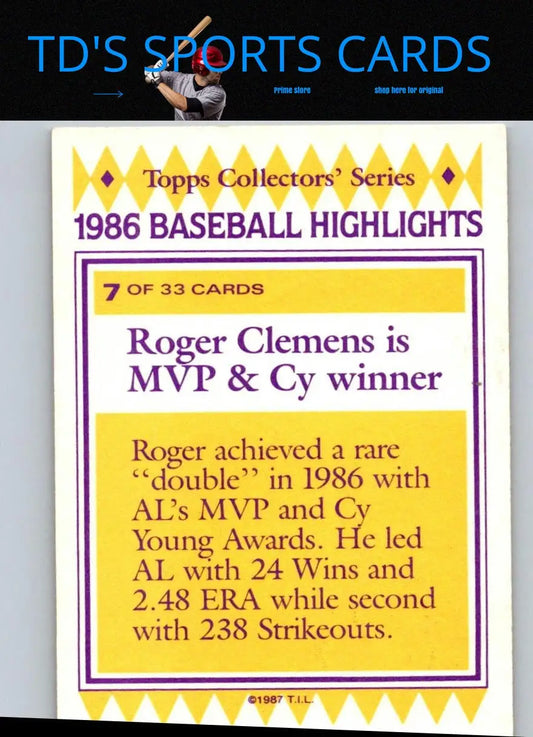 1987 Topps Woolworth Baseball Highlights #7 Roger Clemens