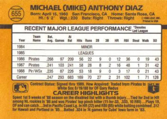 1989 Donruss #655 Mike Diaz NM-MT Chicago White Sox Baseball Card