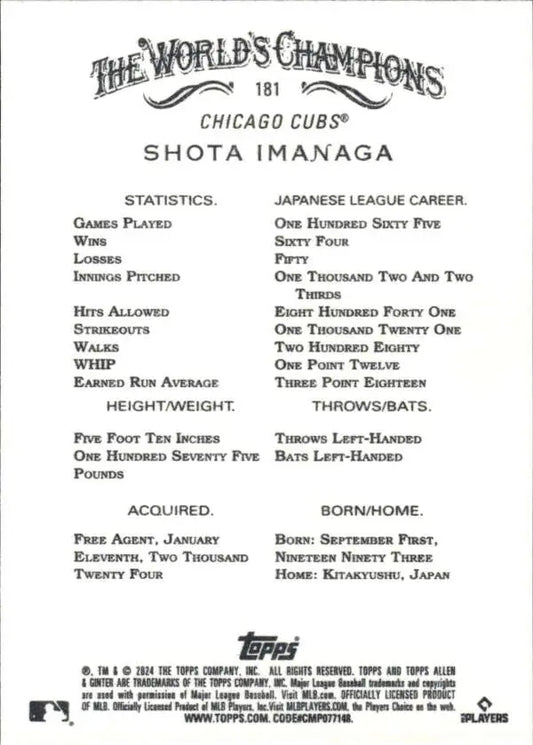 2024 Allen & Ginter #181 Shota Imanaga NM-MT RC Rookie Chicago Cubs Baseball Card