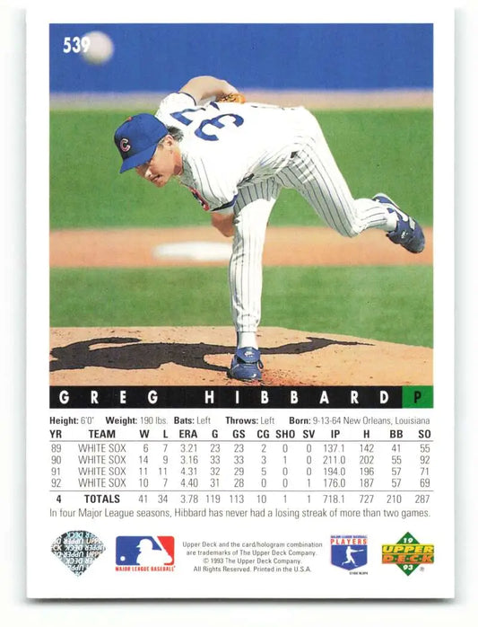 1993 Upper Deck #539 Greg Hibbard VG Chicago Cubs Baseball Card