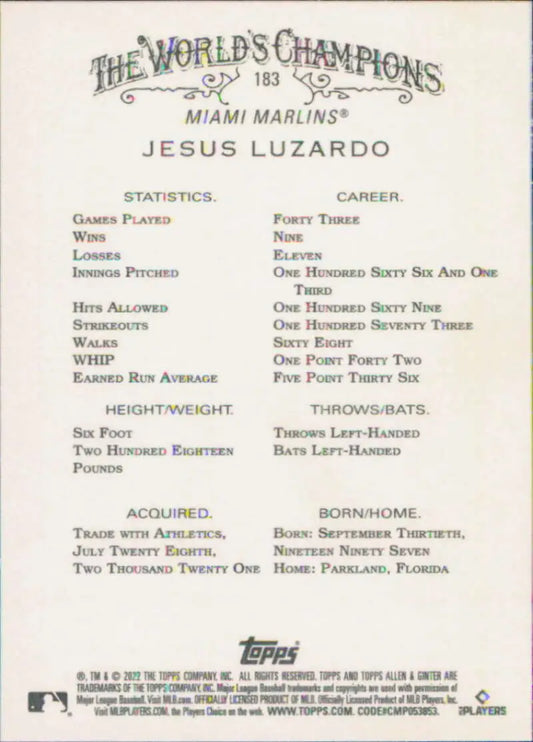 2022 Topps Allen and Ginter #183 Jesus Luzardo NM-MT Miami Marlins Baseball Card