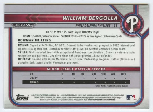 2022 Bowman Chrome Prospects #BCP-159 William Bergolla NM-MT Philadelphia Phillies Baseball Card