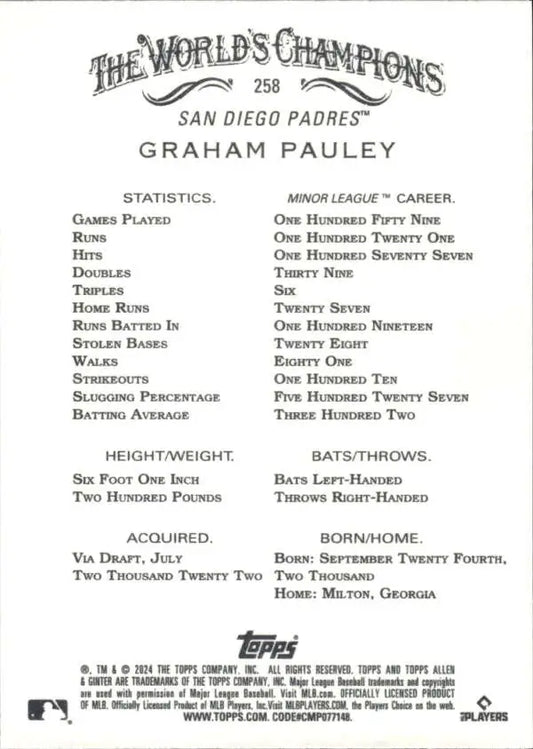 2024 Allen & Ginter #258 Graham Pauley NM-MT RC Rookie San Diego Padres Baseball Card