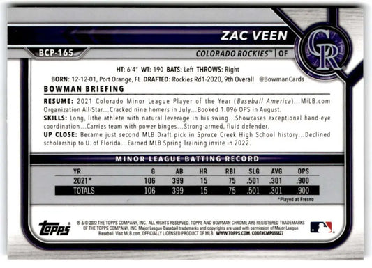 2022 Bowman Chrome Prospects #BCP-165 Zac Veen NM-MT Colorado Rockies Baseball Card
