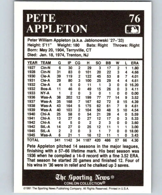 1991 Conlon Collection #76 Pete Appleton EX Excellent Washington Senators Baseball Card
