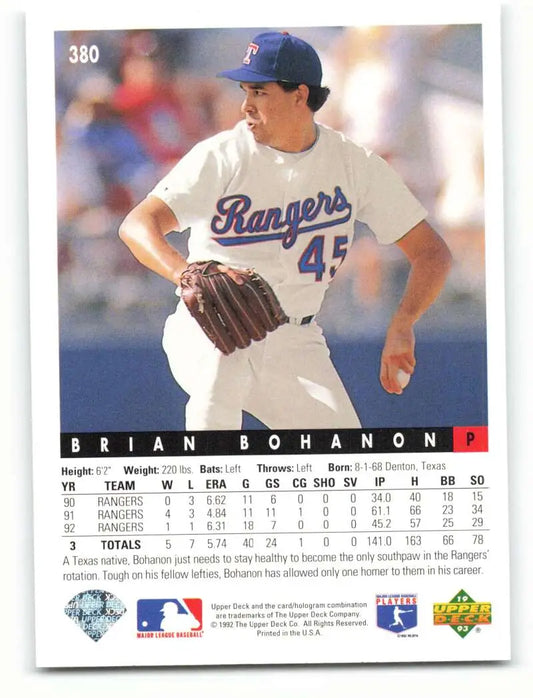 1993 Upper Deck #380 Brian Bohanon VG Texas Rangers Baseball Card