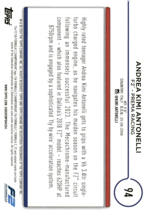 2024 Topps Chrome Formula 1 #94 Andrea Kimi Antonelli NM-MT F2 - PREMA Racing Racing Card