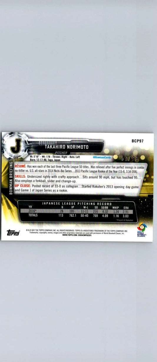 2017 Bowman #BP97 Takahiro Norimoto Prospects Green #/99