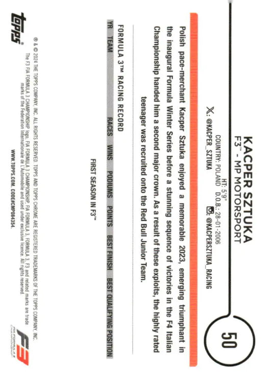 2024 Topps Chrome Formula 1 #50 Kacper Sztuka NM-MT F3 - MP Motorsport Racing Card