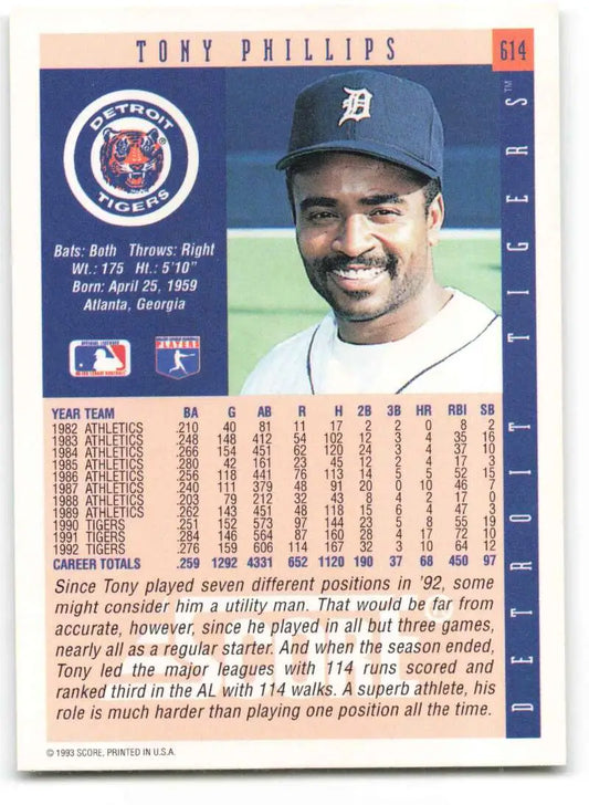1993 Score #614 Tony Phillips NM-MT Detroit Tigers Baseball Card