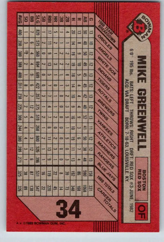 1989 Bowman #34 Mike Greenwell NM-MT Boston Red Sox Baseball Card