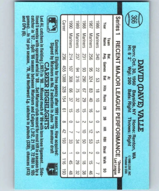 1991 Donruss #366 Dave Valle NM-MT Seattle Mariners Baseball Card