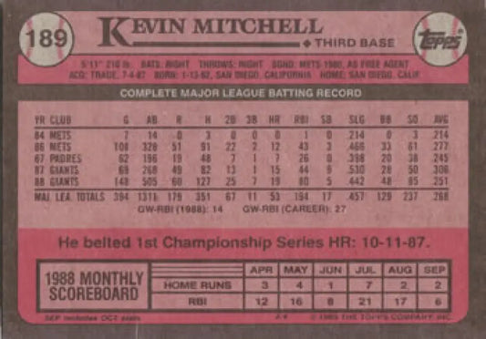 1989 Topps #189 Kevin Mitchell NM-MT San Francisco Giants Baseball Card