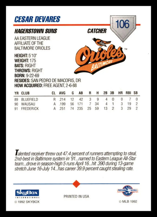 1992 Skybox AA #106 Cesar Devarez Hagerstown Suns NM-MT Baseball Card