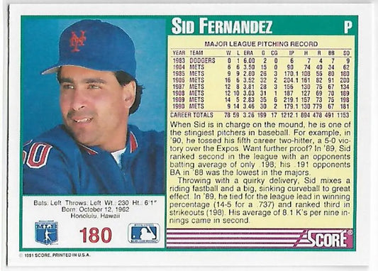 1991 Score #180 Sid Fernandez UER NM-MT New York Mets Baseball Card