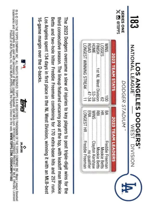 2024 Topps #183 Los Angeles Dodgers NM-MT Los Angeles Dodgers Baseball Card