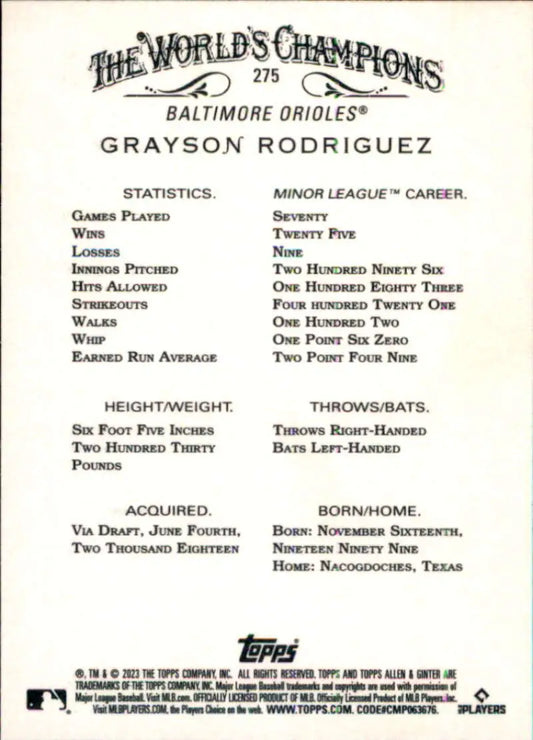 2023 Topps Allen and Ginter #275 Grayson Rodriguez NM-MT RC Rookie Baltimore Orioles Baseball Card
