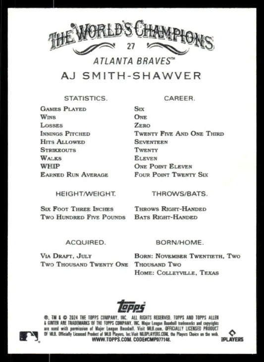 2024 Allen & Ginter #27 AJ Smith-Shawver NM-MT RC Rookie Atlanta Braves Baseball Card