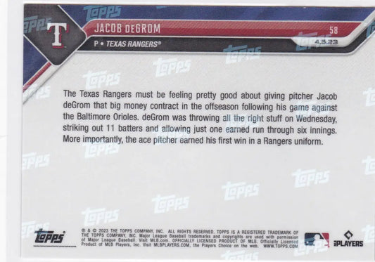 2023 TOPPS NOW #58 JACOB DEGROM- TEXAS RANGERS