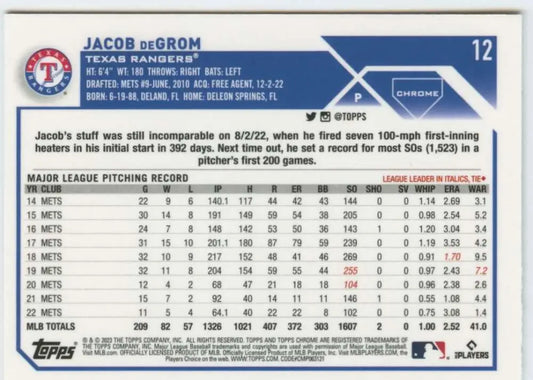 2023 Topps Chrome #12 Jacob deGrom NM-MT Texas Rangers Baseball Card