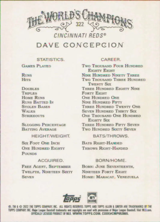 2022 Topps Allen and Ginter #322 Dave Concepcion NM-MT Cincinnati Reds Baseball Card
