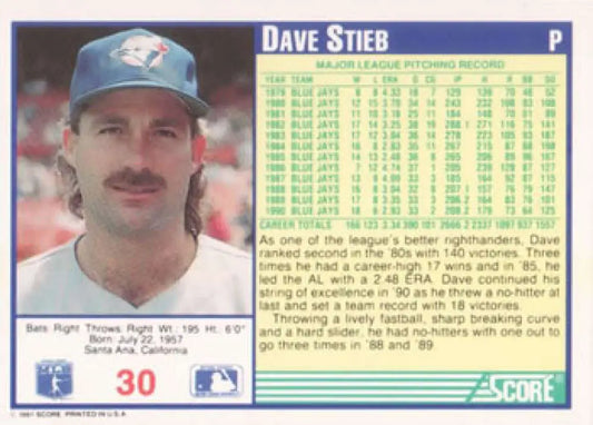 1991 Score #30 Dave Stieb UER NM-MT Toronto Blue Jays Baseball Card