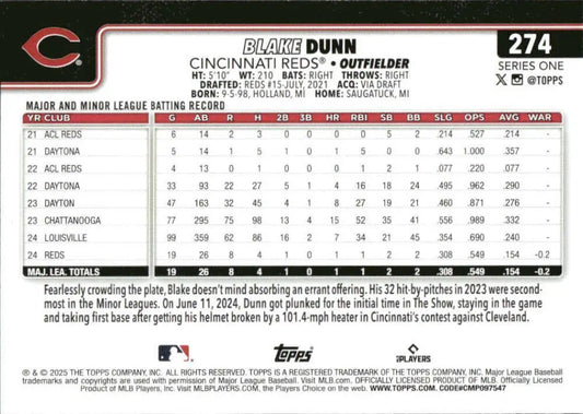 2025 Topps #274 Blake Dunn NM-MT RC Rookie Cincinnati Reds Baseball Card