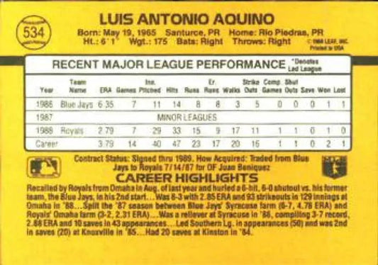 1989 Donruss #534 Luis Aquino DP NM-MT Kansas City Royals Baseball Card