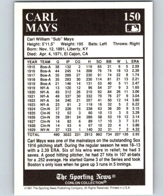 1991 Conlon Collection #150 Carl Mays EX Excellent Boston Red Sox Baseball Card