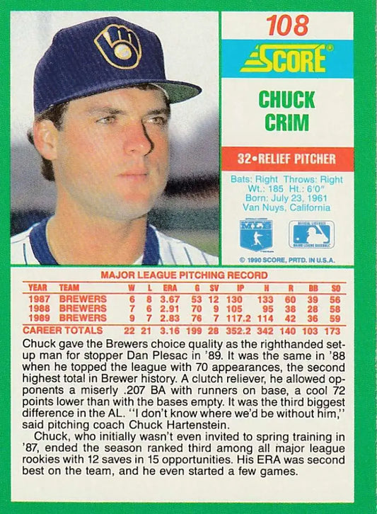 1990 Score #108 Chuck Crim NM-MT Milwaukee Brewers Baseball Card