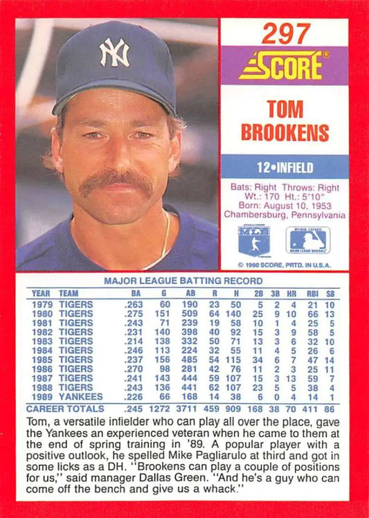 1990 Score #297 Tom Brookens NM-MT New York Yankees Baseball Card