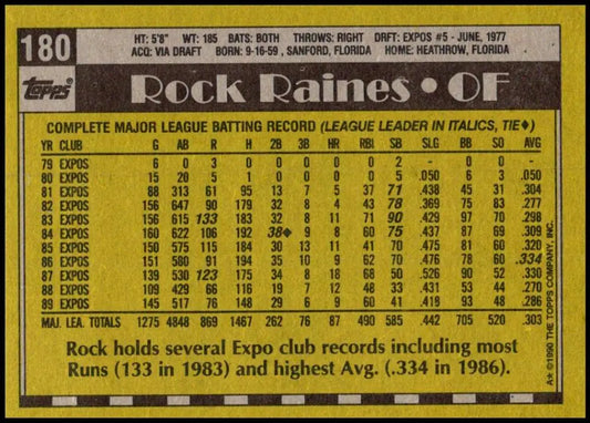 1990 Topps #180 Rock Raines NM-MT Montreal Expos Baseball Card
