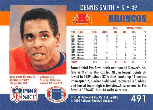 1990 Pro Set #491 Dennis Smith NM-MT Denver Broncos Football Card