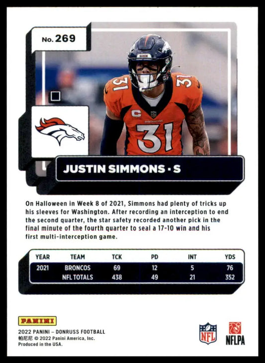 Justin Simmons 2022 Donruss #269 Denver Broncos