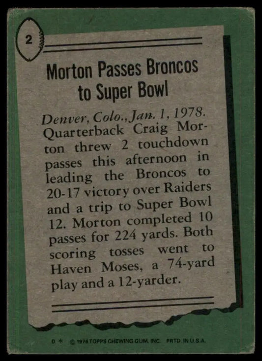 1978 Topps Craig Morton #2 Denver Broncos Football Card NFL Sports