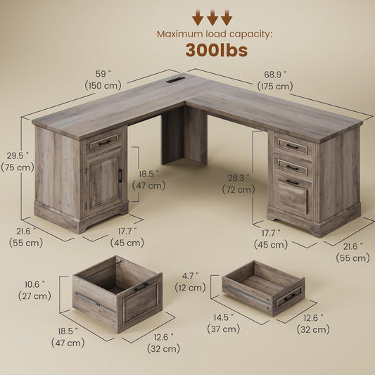 Farmhouse L Shaped Desk, Executive Computer Desk with Drawers and Storage Cabinet, Home Office Desk with File Drawer and Power Outlet, Corner Desk, Workstation for Office Home, Grey